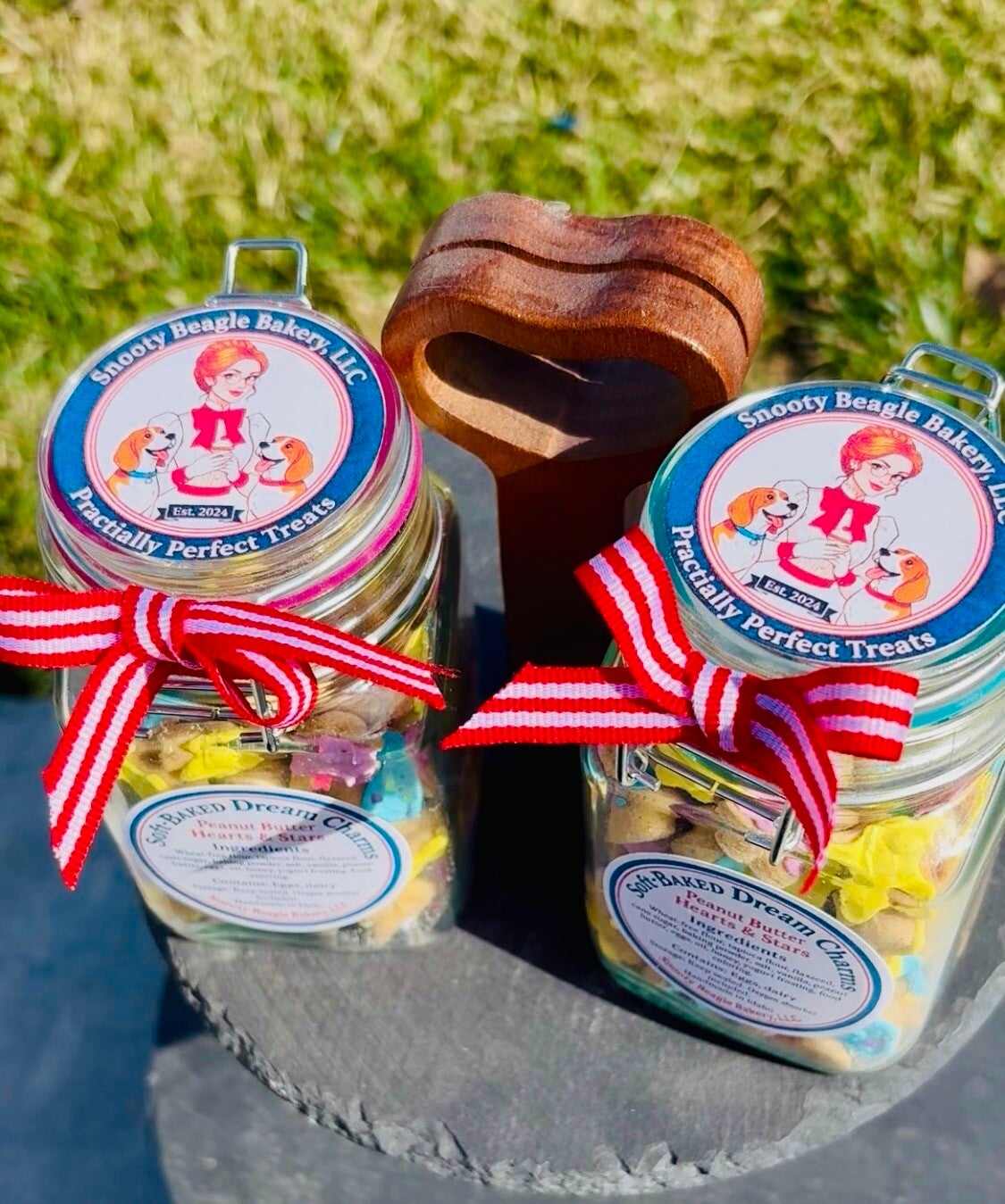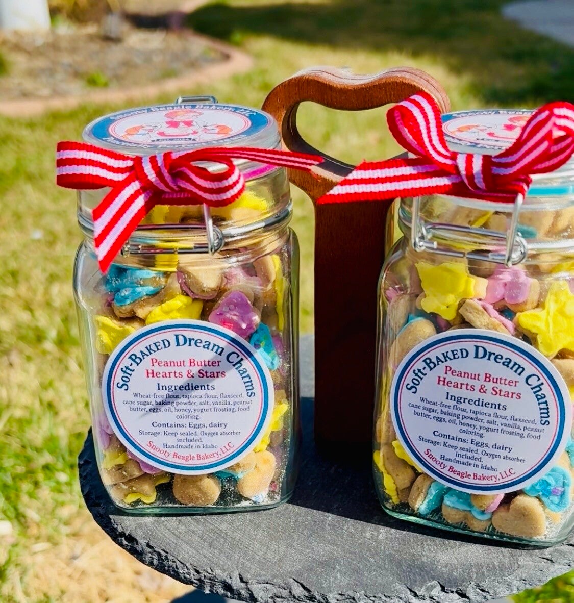 Soft‑Baked Dream Charms are tiny, hand‑cut peanut‑butter hearts and stars crafted for pups who deserve a little everyday magic. Each charm is gently soft‑baked for a tender, chewy texture made especially for small mouths and little dogs — but don’t let the size fool you. Our big Snooty Beagles adore them just as much, proving that great things really do come in small packages.